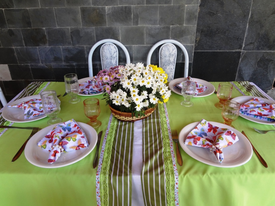 Minha mãe escolheu as cores e preparou toalhas novas para as mesas.